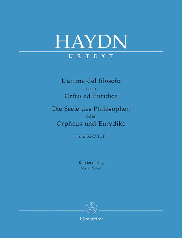 Haydn`s last great work for the stage, the opera L'Anima del filosofo ossia Orfeo ed Euridice, was written in London in 1791 for the rebuilt Haymarket Theatre. The novel thing about it was its use of the chorus both as in A Major vehicle of the plot and as an observer in the manner of Attic tragedy. The premiere scheduled to take place on 31 May 1791 had to be called off when King George lll failed to grant the theatre a license to open. The first staged performance did not take place until 1951 (1) in Florence. This vocal score is based on the urtext from the Complete Edition of Haydn's Works.