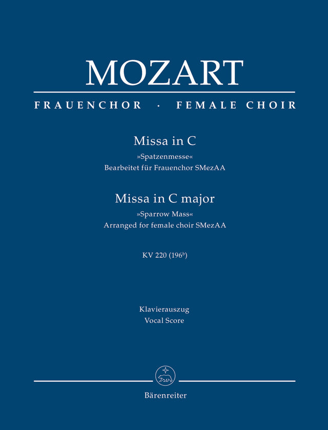 Mozart's "Missa in C Major" (K. 220), nicknamed the "Sparrow Mass" for its frequently recurring characteristic motifs in the violins, has retained a firm place in the choral repertoire to the present day. Now it has been arranged for female choir and is appearing as part of the recently started "Bärenreiter Female Choir" series. Heribert Breuer has judiciously transferred the tenor and bass solos to the high voices and incorporated the original soprano and alto parts largely unchanged into the solo and chorus parts. He has thereby retained the work's original substance while giving it a wholly new and delightful sound.