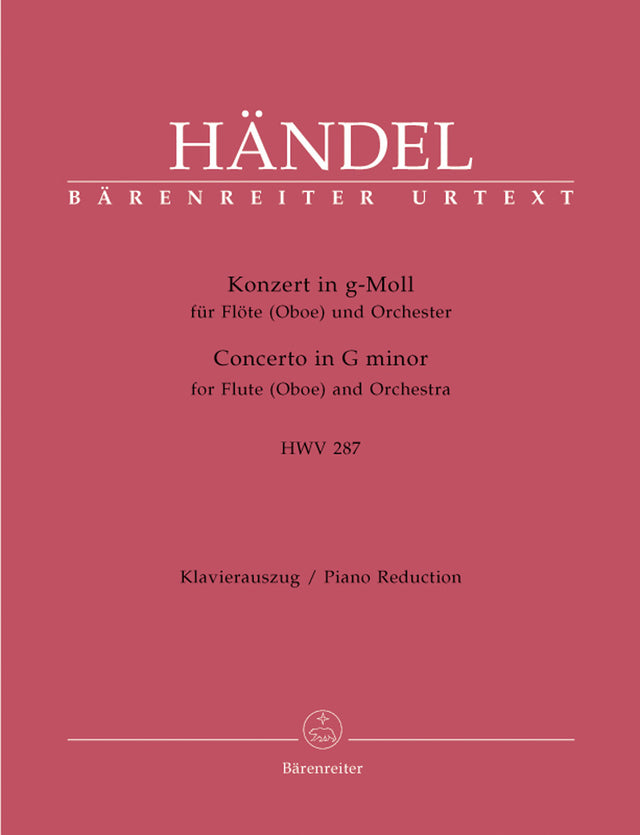 The Concerto for Flute and Orchestra in G Minor, HWV 287 is a first edition. The work has for many years been considered spurious because no contemporary source existed. This concerto was thought to have been written by an amateur musician who borrowed material from Handel's works written or published after 1733. The situation changed drastically when a contemporary set of parts for the concerto, originally copied in Stuttgart for the Erbprinz Friedrich Ludwig von Württemberg, were found in 1993. These parts, copied about 1720, show that the composer borrowed from this concerto for compositions such as the organ concerto HWV 296a, the concerto grosso, Op. 6 No.11, HWV 329 as well as the trio sonata in G Minor, HWV 390. The parts are titled Concerto à 5 for 1 Flut Travers e Hautb , 2 Violino , 1 Alto Viola Col Basso continuo. This critical edition is the first to make use of this new source.